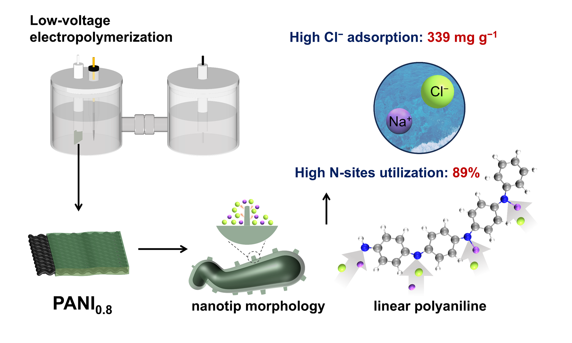 在鹵水資源電化學提取過程中,需兼顧電中性原則,因此高效提取伴生陰離子同樣重要。聚苯胺(PANI)憑借優異的導電性和可逆摻雜特性,廣泛應用于能源存儲、環境凈化和離子分離等領域。然而,傳統PANI因氮活性位點利用率低、微宏觀構效關系不明確等問題,限制了其在高性能電化學脫鹽中的應用。研究團隊創造性發現聚合電位是調控其微觀結構(如聚合度、鏈結構、缺陷類型)的關鍵參數。通過原位電化學光譜等手段論證,采用“低電位”策略可有效抑制偶聯副反應,制備出含納米尖端的低聚度線性結構聚苯胺。該獨特結構顯著提升了含氮位點的暴露效率和可接近性:實現突破性高容量氯離子吸附(Cl容量達339 mg/g)和鈉離子吸附(142 mg/g)。該工作顯著推動了結構可控聚合物的設計及其在電化學分離中的應用。