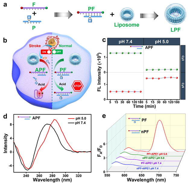研究團(tuán)隊(duì)以酸性pH響應(yīng)的i-motif結(jié)構(gòu)F鏈為傳感核心,通過與含有APE1酶特異性識(shí)別位點(diǎn)的互補(bǔ)“阻斷鏈”P鏈雜交,構(gòu)建可激活型pH探針(PF)。進(jìn)一步經(jīng)脂質(zhì)體包封形成LPF,顯著提升了其血腦屏障穿透能力及在體穩(wěn)定性。該傳感器僅在APE1高表達(dá)的缺血病灶區(qū)被激活后,才能實(shí)現(xiàn)對(duì)缺血腦區(qū)pH的高對(duì)比度、高特異性比率型成像(圖1)。在腦卒中動(dòng)物模型中,LPF成功實(shí)現(xiàn)了對(duì)腦內(nèi)pH梯度的動(dòng)態(tài)、空間分辨監(jiān)測(cè),清晰勾勒出缺血區(qū)域,展現(xiàn)出優(yōu)異的血腦屏障穿透能力與成像信噪比(圖2)。以上研究為腦卒中早期檢測(cè)、機(jī)制研究和新藥研究提供了新策略。