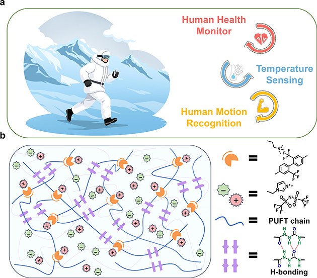 為探索聚氨酯材料的應用潛力,基于上述研究,研究人員對聚氨酯材料內部分子網絡設計和功能化進行深入研究。為實現材料的導電性,引入更多具有額外極性的極性鍵是一種可能的策略,如碳-氟(C-F)鍵。由于F原子的高電負性,C-F鍵的強靜電性質會增強進入體系的電子極性,這樣陰離子和陽離子可彼此分布得更遠,在聚合物內部移動更自由。基于此,研究人員提出了一種分子工程范式,利用氟的雙重功能在聚氨酯基質中構建空間相關但功能獨立的動態網絡。通過引入含氟擴鏈劑和多氫鍵單元,構建了氟-陽離子相互作用與高密度氫鍵協同的動態網絡,氟的高電負性不僅與封端劑形成離子鍵增強網絡穩定性,還通過偶極相互作用固定陽離子,構建陰離子傳輸通道,保障離子高效遷移。從而成功制備了一種具備超敏感多參數監測功能,可用于極地可穿戴設備形狀記憶聚氨酯材料。