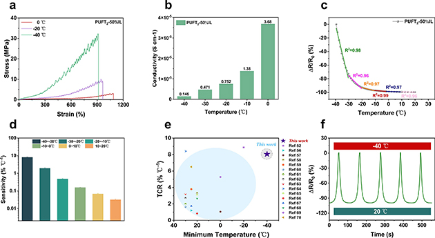 針對極地等極端環境的挑戰,團隊重點測試了材料的低溫耐受性。在-40℃時,材料仍能保持較高的強度、韌性、可拉伸性和離子電導率。此外,該材料表現出負溫度系數行為,在-40℃至-30℃超低溫區間的溫度系數電阻高達8.05% ℃-1,且在連續熱循環測試中表現出良好的穩定性和可重復性,彰顯了其在深冷環境下可靠應用的潛力。