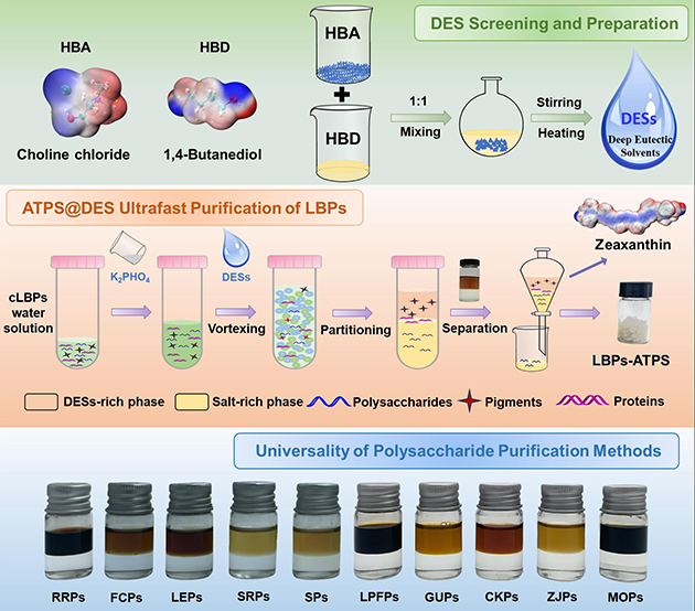 高效、精準的分離純化是開展多糖精細結構解析和活性研究的重大難題,而樣品前處理是多糖分離純化的重要基礎和前提。傳統多糖分離純化的樣品前處理技術包括脫脂、脫蛋白和脫色等過程,不僅操作繁雜、時間冗長,而且會導致多糖流失、結構變化和活性失活等。針對上述問題,課題組提出了將低共熔溶劑(Deep Eutectic Solvents,DES)引入雙水相體系(Aqueous Two-Phase System,ATPS)的新思路,構建了新型ATPS@DES多糖樣品前處理新體系,實現了枸杞多糖同步脫脂、脫蛋白和脫色;同時,在此溫和、綠色的條件下,實現了枸杞多糖高保留率和最大程度保持多糖的原始結構特征。