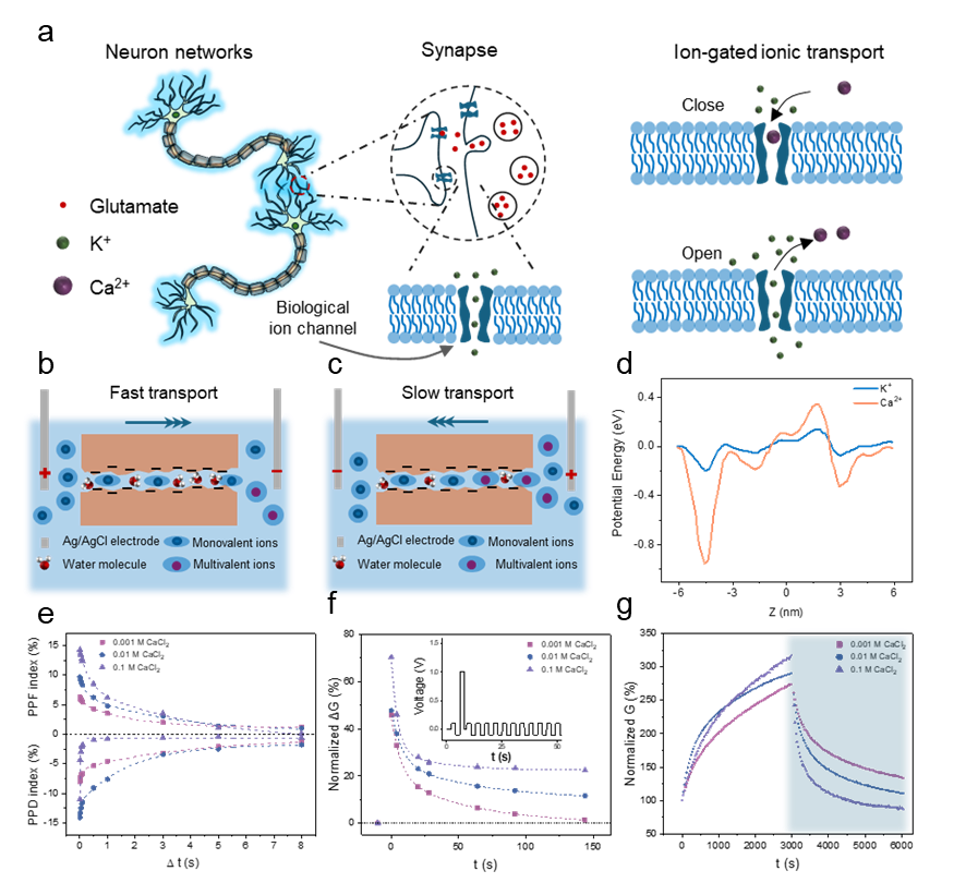 圖:基于亞納米通道離子徑跡膜制備的納流體憶阻器仿生原理及其突觸功能演示
