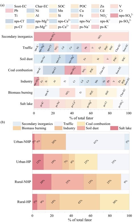 針對這一問題,中國科學院青海鹽湖研究所相關研究團隊于2020年1月至2023年3月在柴達木盆地南部6個監(jiān)測點持續(xù)開展月度大氣降塵采樣。結(jié)果表明,柴達木盆地南部大氣降塵的化學組成呈現(xiàn)明顯鹽塵影響特征,鄉(xiāng)村地區(qū)鹽湖來源離子貢獻較高,表明鹽湖裸露地表和周邊鹽漬化土壤是區(qū)域重要自然塵源;碳質(zhì)組分分析進一步發(fā)現(xiàn),供暖期有機碳、元素碳及char/soot比值明顯升高,反映出固體燃料燃燒排放增強。源解析結(jié)果顯示,非供暖期降塵主要受交通排放和土壤揚塵影響,供暖期則主要受煤炭和生物質(zhì)燃燒影響;其中,鹽塵對鄉(xiāng)村地區(qū)非供暖期降塵貢獻較為顯著。總體來看,供暖活動不僅增強了碳質(zhì)組分排放,還可能通過改變局地氣象條件并疊加道路揚塵、除冰鹽使用等人類活動,與鹽湖和土壤揚塵共同影響區(qū)域降塵組成。