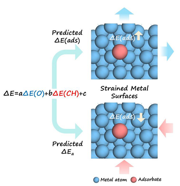 在多相催化反應中,活性金屬表面的電子結構對反應物分子的吸附與活化轉化起著關鍵作用。近年來的研究表明,通過對金屬晶格施加拉伸或壓縮應變,可有效調控其表面電子結構,顯著改變反應物及關鍵中間體的吸附行為,進而實現對催化活性與選擇性的精準調控。目前,應變工程已成為設計高性能催化劑的重要策略。然而,不同金屬體系和不同吸附物對應變呈現出復雜且差異化的響應規律,至今仍缺乏可定量描述應變誘導能量變化的普適性標度關系,制約了高效催化劑的理性設計與精準構筑。