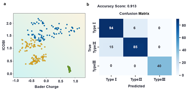 團隊進一步引入機器學習分類方法,以ICOBI(晶體軌道鍵指數)和Bader電荷轉移量為特征,訓練支持向量分類器。五折交叉驗證表明分類器達到較高準確率,在不依賴電負性概念的前提下,從電子結構層面揭示了共價鍵合與離子鍵合特性之間的區別是不同吸附物應變響應差異的物理本質。