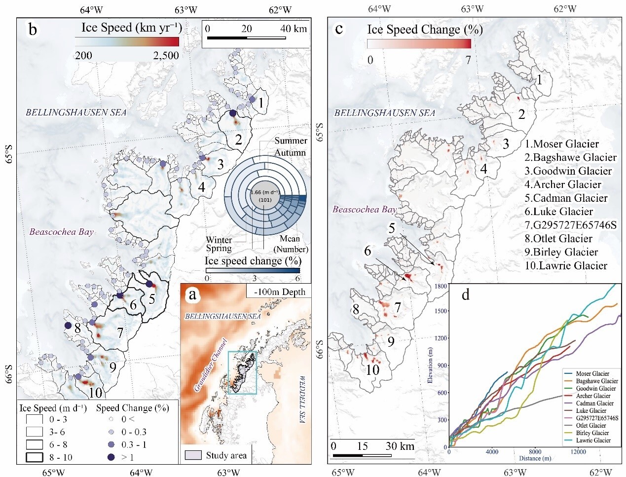 中國科學院西北生態環境資源研究院冰凍圈科學與凍土工程全國重點實驗室康世昌研究員團隊,基于2015年5月至2025年4月的Sentinel-1衛星觀測數據,系統分析了南極半島Beascochea海灣101條冰川流速變化特征,重點揭示了海灣上層海水變暖對冰川流速加快的關鍵作用。