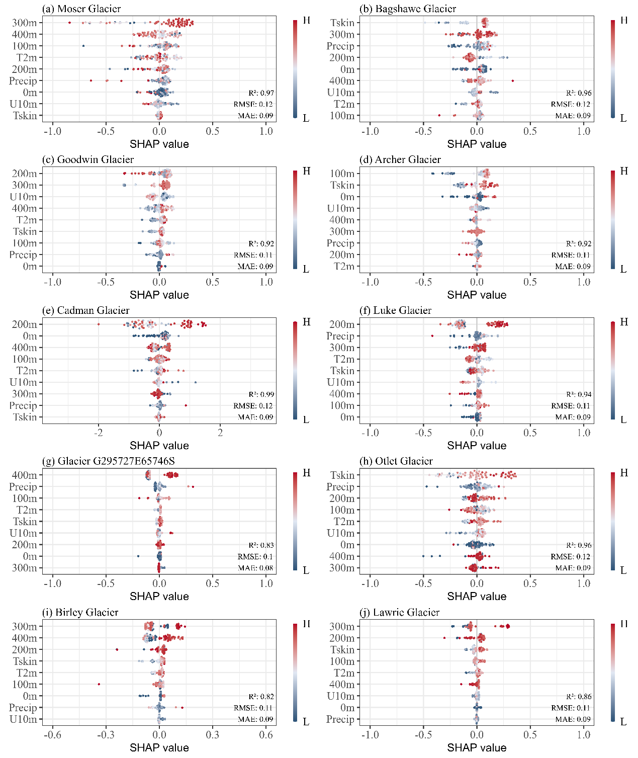 通過XGBoost 與 SHAP 模型分析不同驅動因子對冰川流速的影響。0-400 m 代表不同深度的海洋溫度;Precip 表示冰川表面降水量;T2m 表示 2 米氣溫;U10m 表示 10 米風速;Tskin 表示冰川表面溫度。