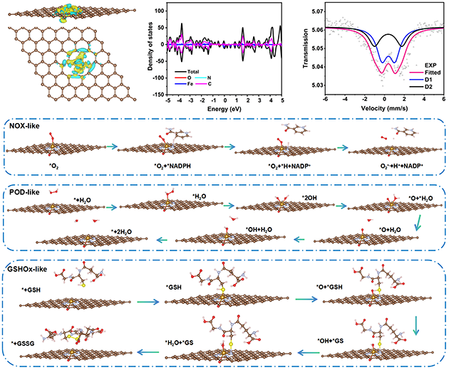 近日,中國科學院蘭州化學物理研究所天然藥物與化學測量研究中心海軍研究員團隊,發展了一種以氧化石墨烯為二維支撐載體的Fe單原子納米酶(FeNC SAzymes)。與傳統平面Fe-N4構型相比,軸向O配位的引入有效打破了對稱配位限制,增強了活性中心的電子調控能力(圖1)。此外,密度泛函理論計算解析該關鍵活性能有效降低多酶反應途徑的能量勢壘,從而提升NOX、POD和GSHOx等多酶樣級聯相關過程的反應效率,為后續觸發后放大效應提供基礎(圖2)。FeNC SAzymes結構設計使Fe中心的電荷分布和d軌道電子態密度得到優化,從而提升其對反應中間體的吸附與活化能力以及電子轉移效率,為實現TME識別、可視化檢測和響應研究提供了新方法。